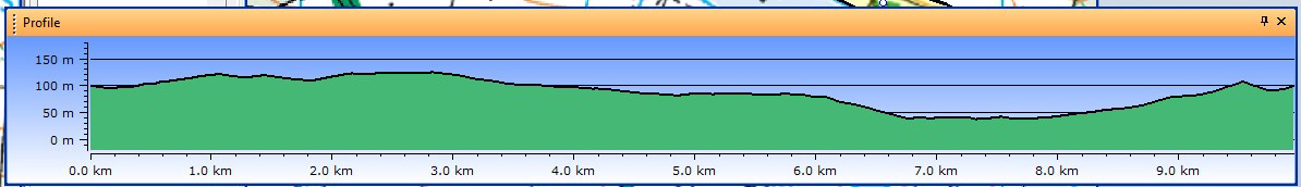 The profile shows kilometers on the horizontal scale and metres above sea level vertically. On the left is the race start. The race is on the whole undulating for about 4k, but note there is a slight rise to 1k at which point is leaves the park on to the main road (Cortworth Lane).